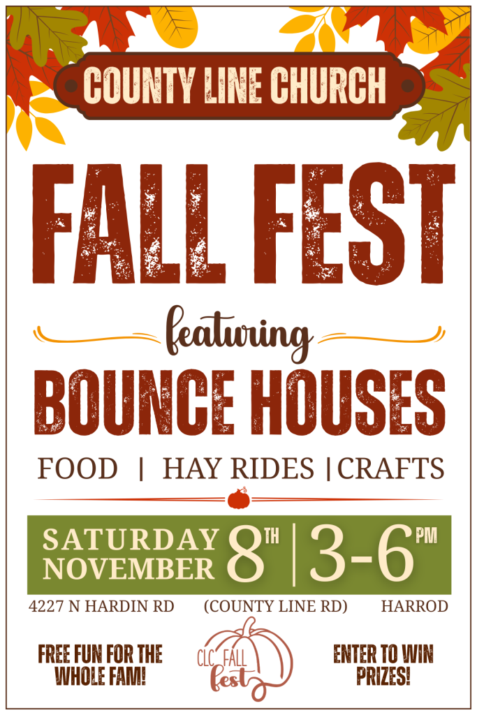 Located on the corner of County Line Rd (County Rd 15) and Sandusky Rd. County Line is a non-denominational Bible-based and spirit-filled church located 5 minutes from Ada, and Ohio Northern University and 10 minutes from Bluffton, Ohio and Bluffton University.